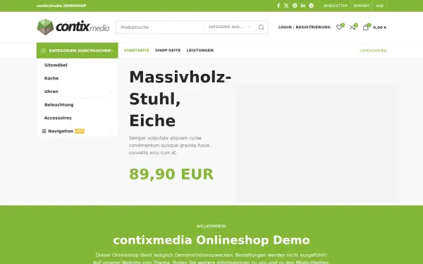 Description: Demoshop von contixmedia. Ein Onlineshop auf Basis von WordPress, Woocommerce und Elementor, technische und gestalterische Möglichkeiten.