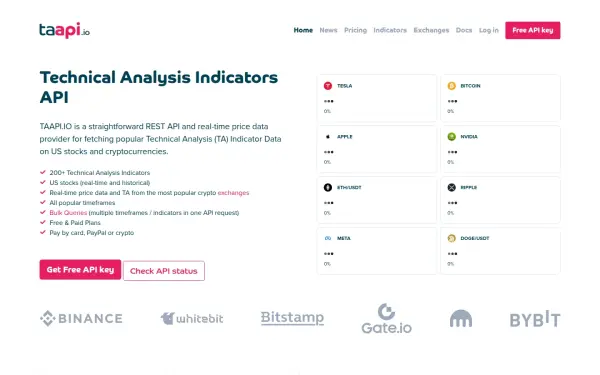 Description: TAAPI.IO is a #1 API providing real-time price data and technical analysis indicators (TA) like RSI, MACD and 200+ more. Stocks, crypto and forex available.