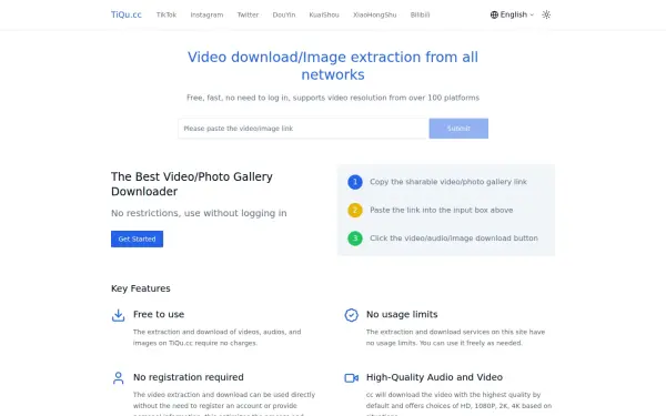 Description: TiQu.cc ist ein kostenloses Video-Download-Tool, das den Download von Videos und Audios von über 100 Plattformen wie VK, TikTok, Facebook, Twitter, Instagram, Vimeo, Telegram etc. unterstützt. Sie können hochwertige 1080p, 2k, 4k Videos und Bilder...