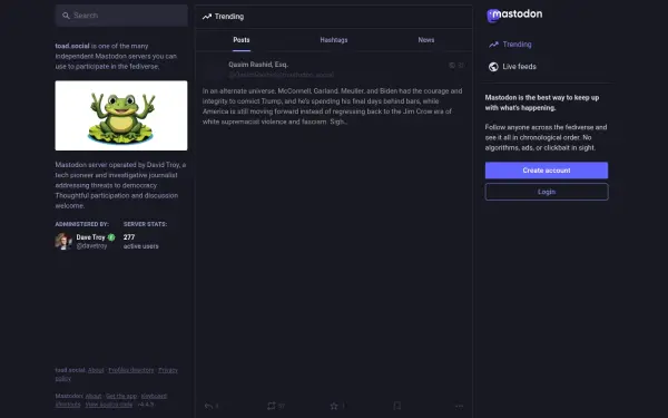 Description: Mastodon server operated by David Troy, a tech pioneer and investigative journalist addressing threats to democracy. Thoughtful participation and discussion welcome.