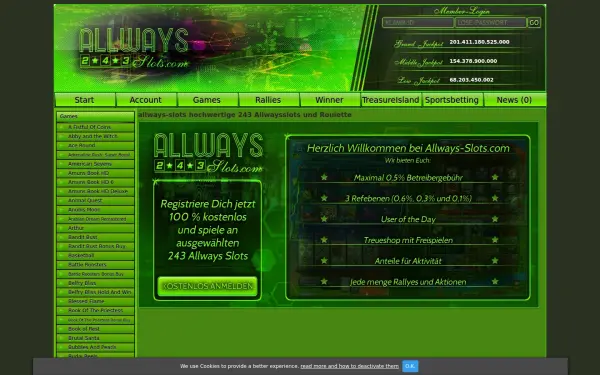 Description: allways-slots das Punkte Casino mit Klammlosen hat exclusive Slots, Roulette, Rallies, Treueshop, Aktien, User des Tages, Aktivrente und hohe Jackpots