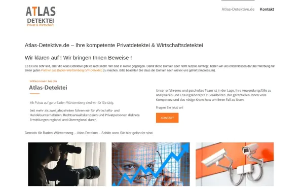 Description: Atlas-Detektive.de - Ihre kompetente Privatdetektei & Wirtschaftsdetektei Wir klären auf ! Wir bringen Ihnen Beweise ! Es tut uns sehr leid, aber die Atlas-Detektive gibt es nicht mehr. Wir sind in Rente gegangen. Damit diese Domain aber nicht...