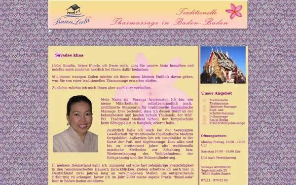 Description: Traditionelle Thaimassage in authentischem Ambiente im Herzen der Stadt Baden-Baden direkt beim B?derviertel nur 3 Gehminuten vom Vincenti Parkhaus, Sophienstra?e