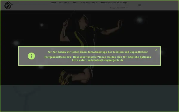 Description: Herzlich willkommen beim Siegburger TV Badminton! UnserAngebot Trainingszeiten Wähle den Trainingstag und erhalte Informationen zu Anfahrt und Programm Montag