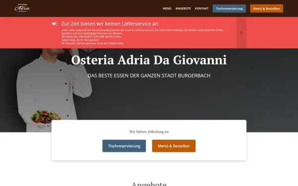 Description: Bestellen Sie online zum Mitnehmen oder reservieren Sie einen Tisch. Bei Osteria Adria Da Giovanni in Burgerbach erleben Sie köstliche Pizza, Salate, Pasta Küche. Probieren Sie unsere köstlichen Gerichte aus, die sorgfältig aus frischen Zutaten...