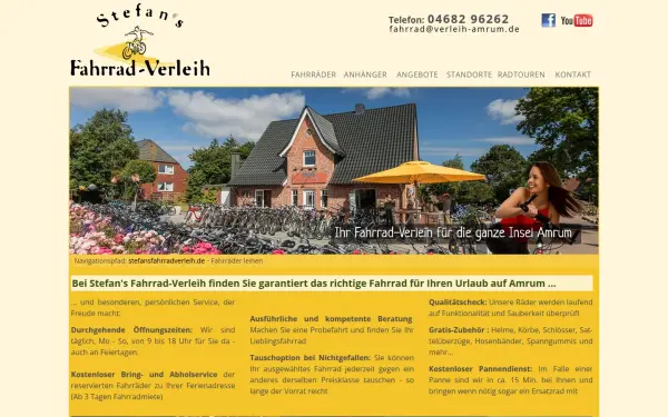Description: Bei Stefan's Fahrrad-Verleih finden Sie garantiert das richtige Fahrrad für Ihren Urlaub auf Amrum. Ihre Vorteile: Durchgehende Öffnungszeiten, kostenloser Bring- und Abholservice, ausführliche und kompetente Beratung, Gratis Zubehör, kostenloser...
